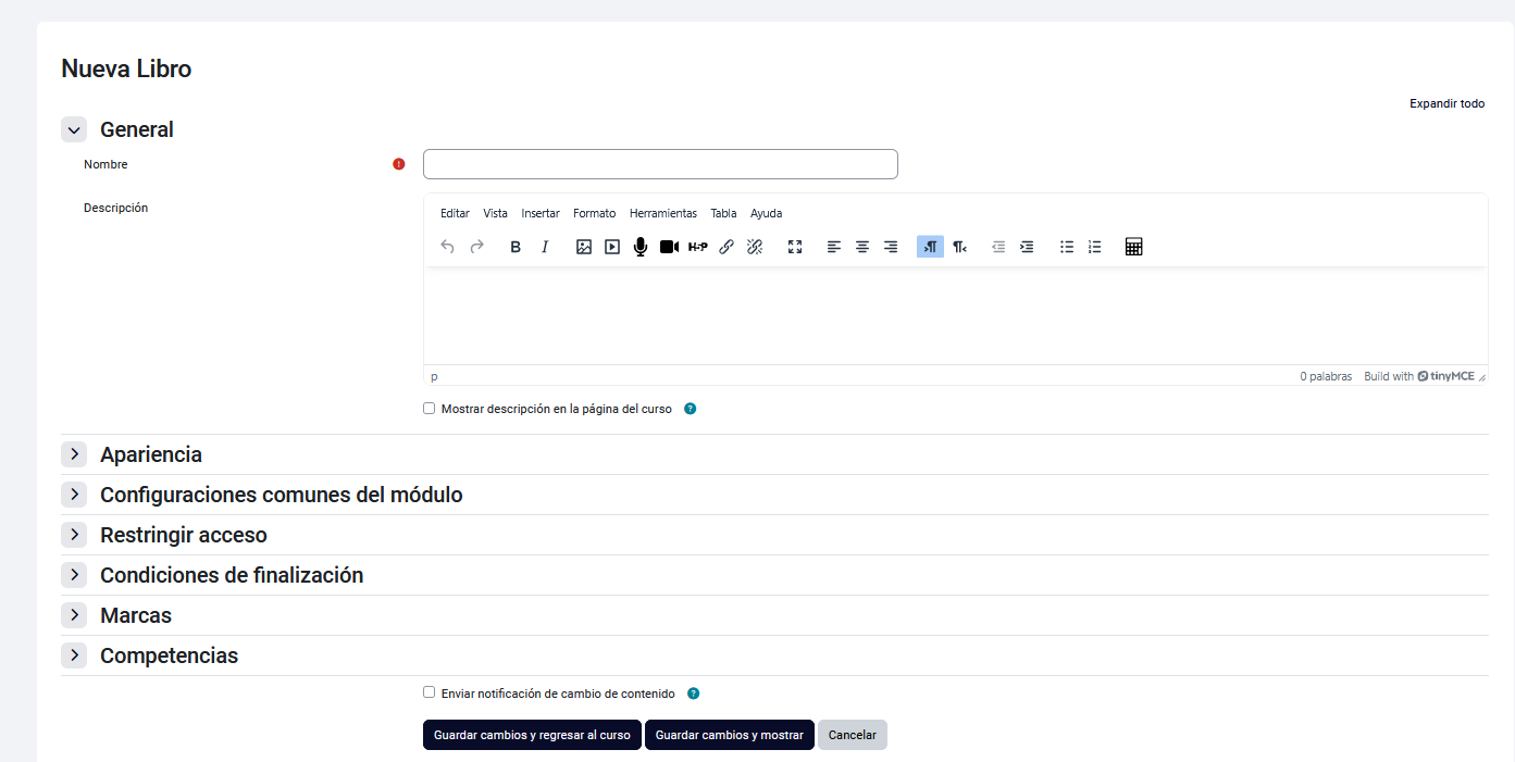 En la ventana de configuración de este elemento, escribimos el nombre del libro y hacemos clic en guardar cambios y mostrar. Se abrirá una pestaña para escribir la información de la primera página del libro, que corresponde con el primer capítulo: escribimos su nombre, completamos la descripción y hacemos clic en guardar cambios.