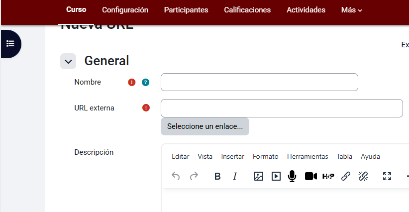 Especificamos el nombre que tendrá dicho enlace y la URL. Para cumplir las normas de accesibilidad, el nombre debe ser descriptivo, por ejemplo: "Cómo crear una enlace en Moodle (YouTube)".